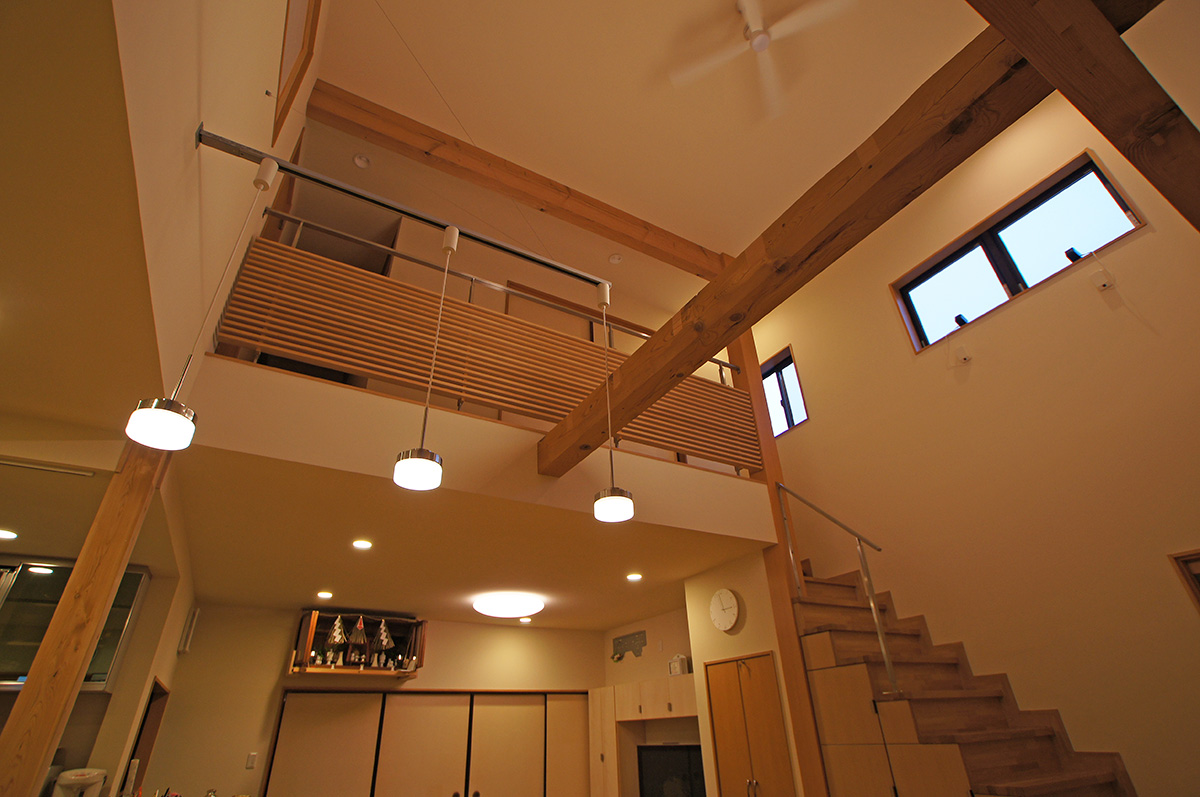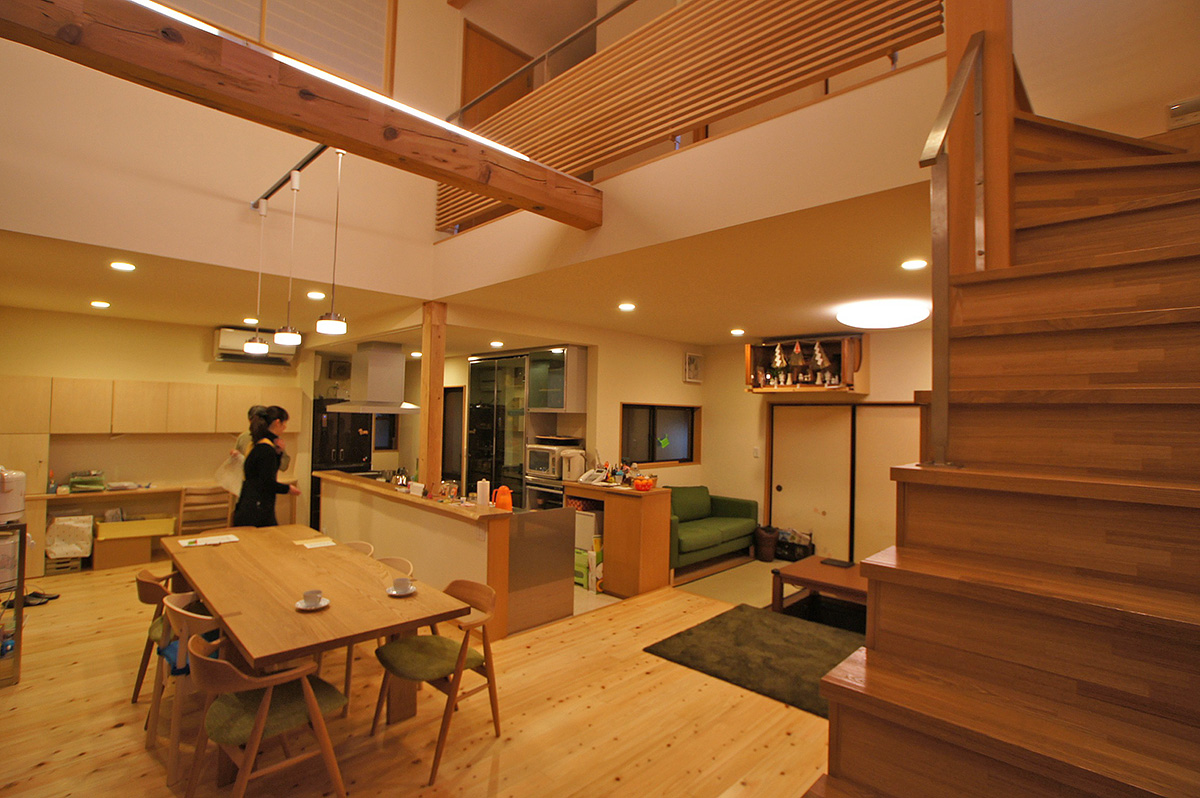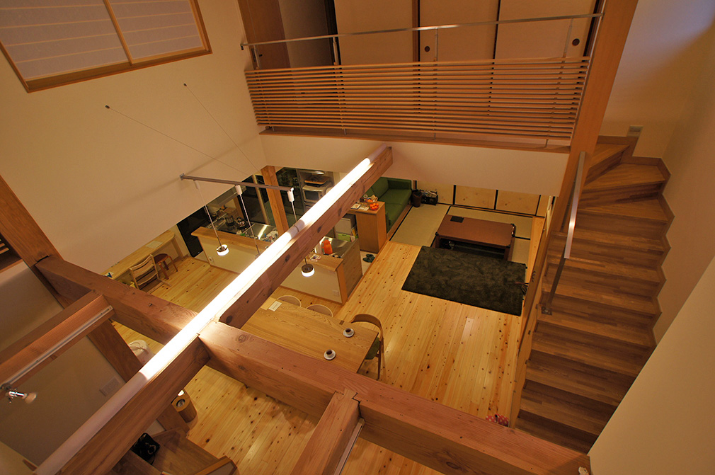 従来の日本家屋によくみられる、障子や襖で部屋を小さく仕切られていた住宅。仕切られすぎてダイニングや居間は日中も光も入らない場所に。2階の1つの床を抜き、間仕切りを取り、床をフラットに。あとは、動線や視線、使い方を考えながら家具で調整することで、緩やかにつながる家としました。ダイニングの吹き抜けに面して2階の子供部屋を設けることで、見えなくても音だけで人の気配がわかる空間になりました。