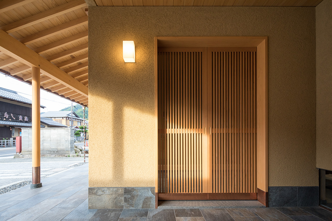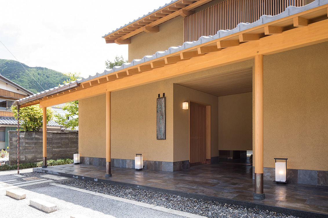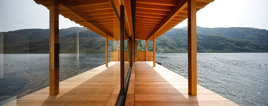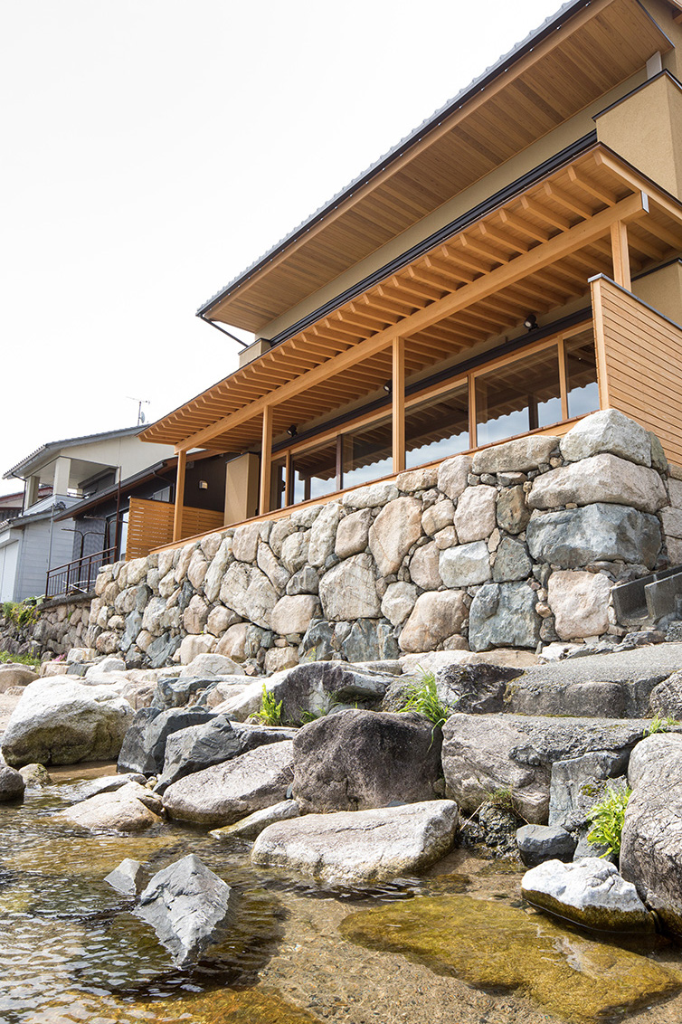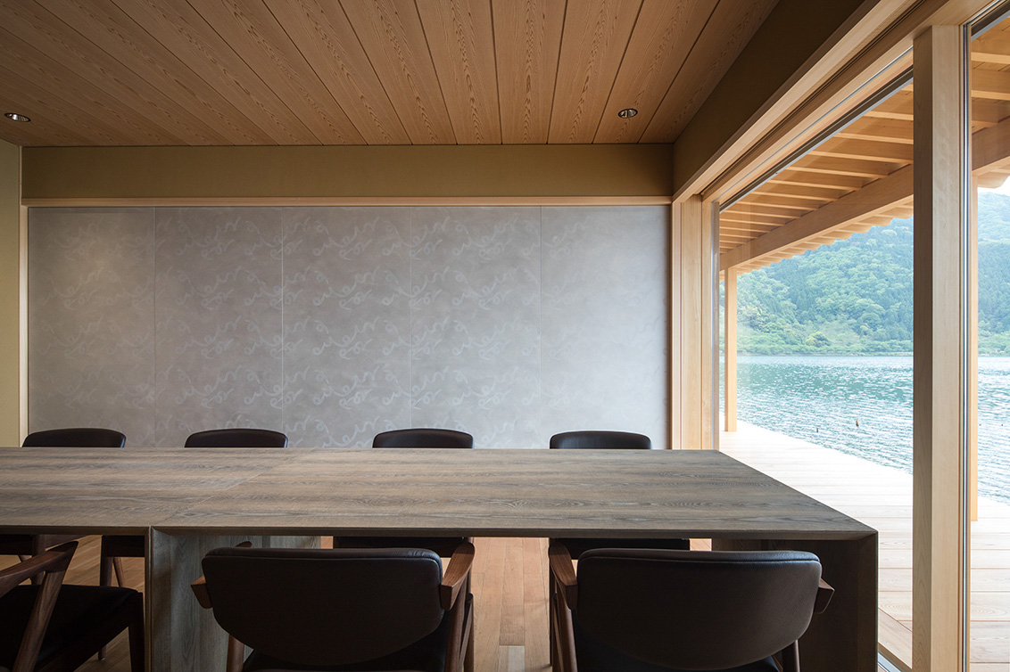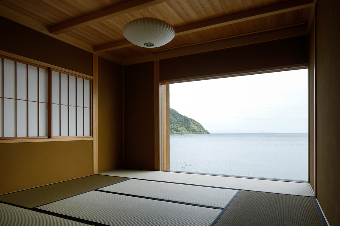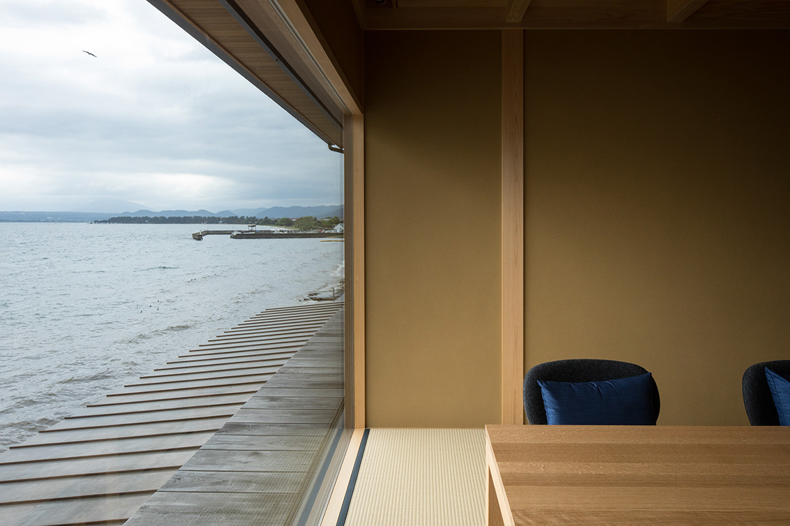 平成30年の台風で被災した滋賀県高島市琵琶湖岸に建つ「湖里庵」再建プロジェクトです。単なる再現ではなく、風や雪等の自然環境を考慮した建物形状の検討、琵琶湖の眺望を生かすため、大スパンのガラスとし、柱以外見えないよう工夫することで中外の一体化を目指しました。料亭と一日一客の旅館との両立、旧街道沿いの宿場町であったこの地域が持つ、路地空間やたまり・抜けの規則性や湖里庵らしさを取り入れる計画としました。